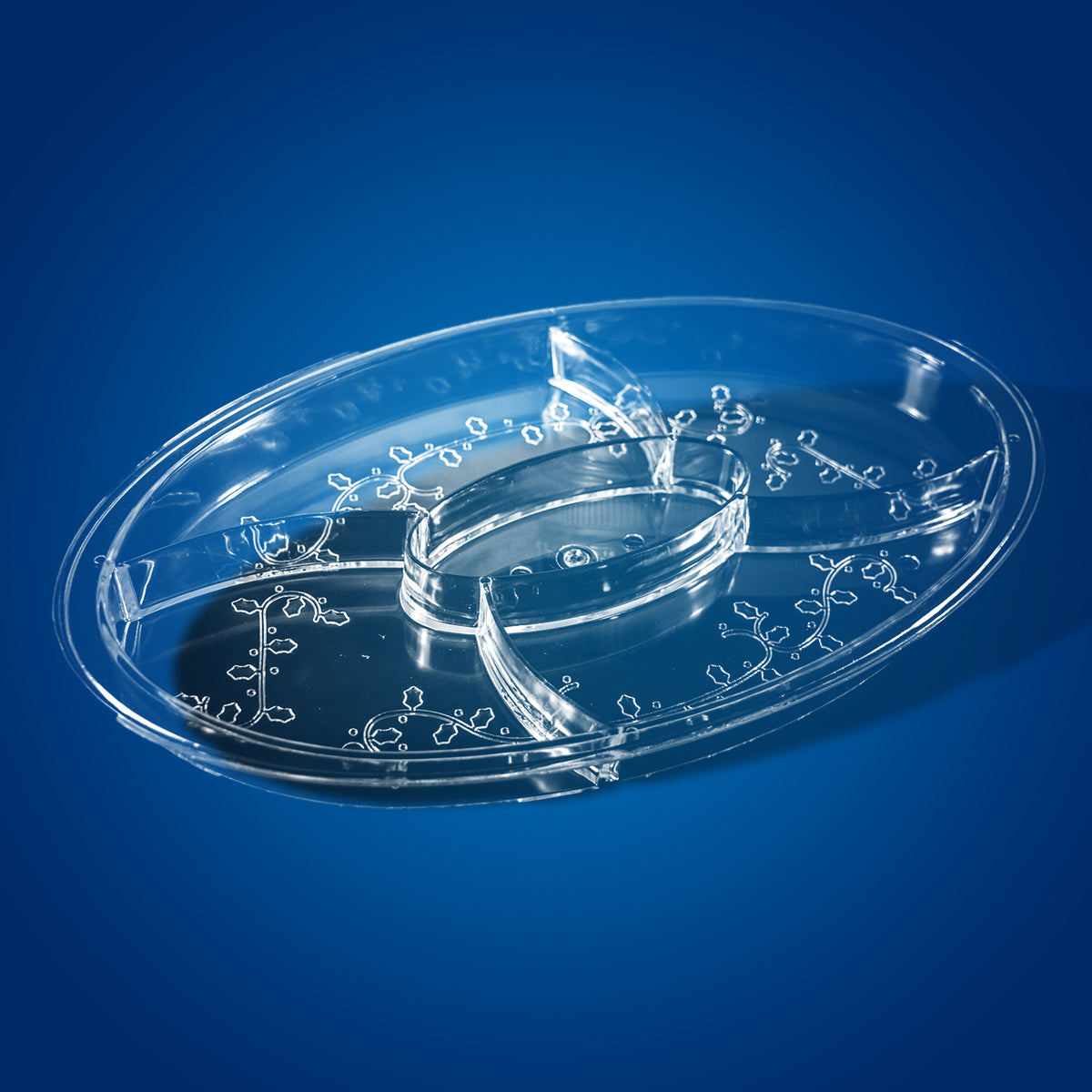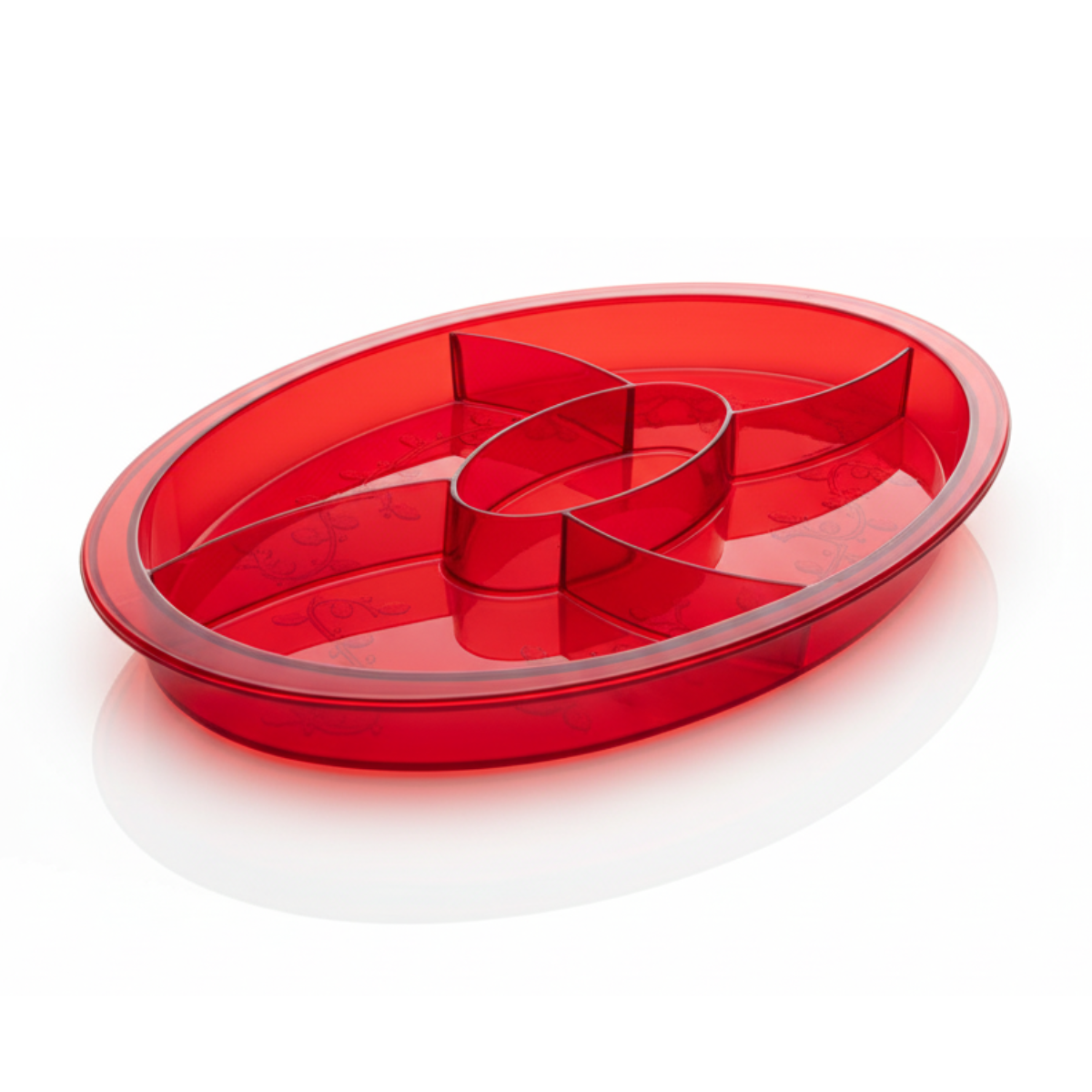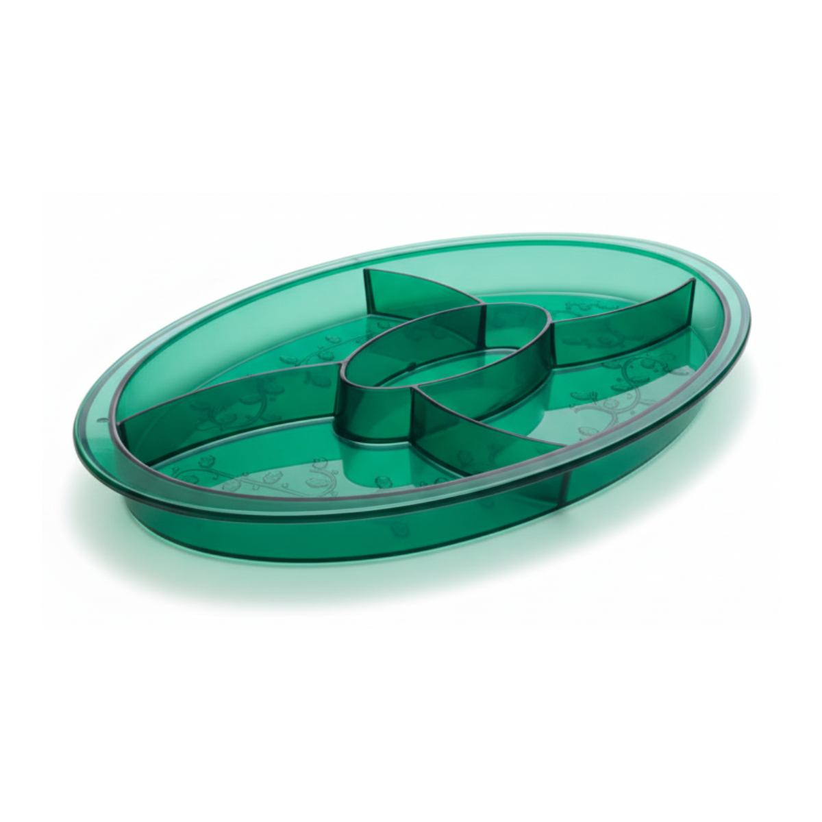 Charola ovalada de plástico con 5 divisiones y capacidad de 28.2 oz (834 ml), ideal para botanas, dulces y aperitivos en fiestas, reuniones o catering. También perfecta para decoración y manualidades. Disponible en colores natural, rojo, verde oscuro y oro. Medidas: 32 cm x 20 cm, con altura de 2.5 cm.